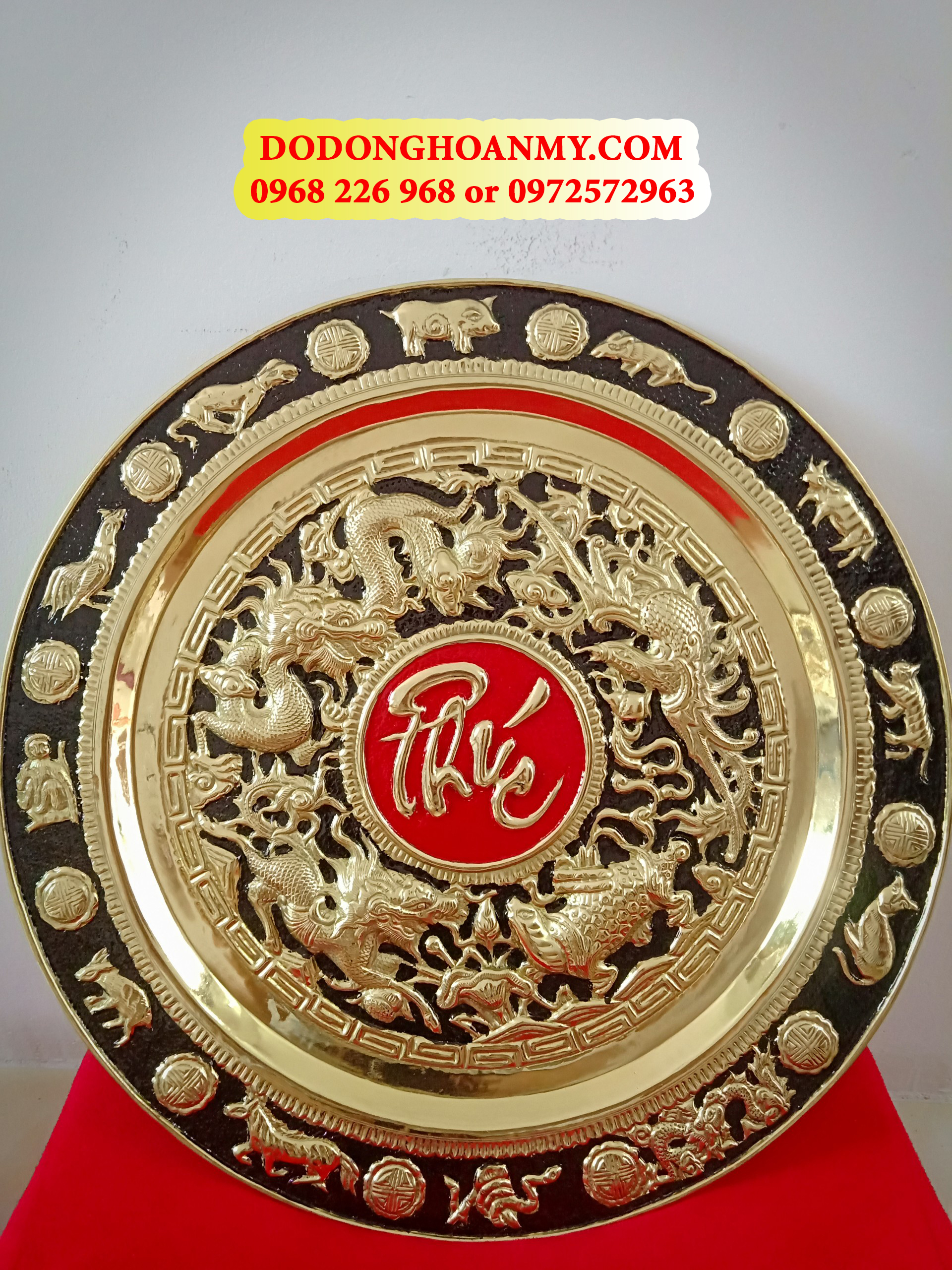 Mâm đồng tứ linh được chạm khắc tinh xảo với bốn con vật linh thiêng ở trung tâm, xung quang vòng tròn đồng tâm là 12 con giáp. Tứ linh nghĩa là có 4 loài linh vật ,chúng có mặt trong văn hóa của nhiều nước phương Đông trong đó có cả Việt Nam. Thực tế, tứ linh gồm Long, Lân, Quy, Phụng được dân gian bắt nguồn từ bốn linh thần:Thanh Long, Bạch Hổ, Huyền Vũ và Chu Tước. Chúng được người xưa tạo ra từ bốn chòm sao cùng tên ở bốn phương trời. Chúng mang bên mình bốn nguyên tố tạo thành trời đất theo quan niệm của người xưa (lửa, nước, đất và gió). Đầy đủ và hòa hợp các nguyên tố trên chính là tiêu chí để lựa chọn kinh đô của các bậc đế vương thời xưa.